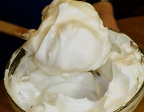 Cho đường vào từ từ (chia 3 lần), tiếp tục đánh đến khi bông mềm, tạo chóp cong nhẹ.
