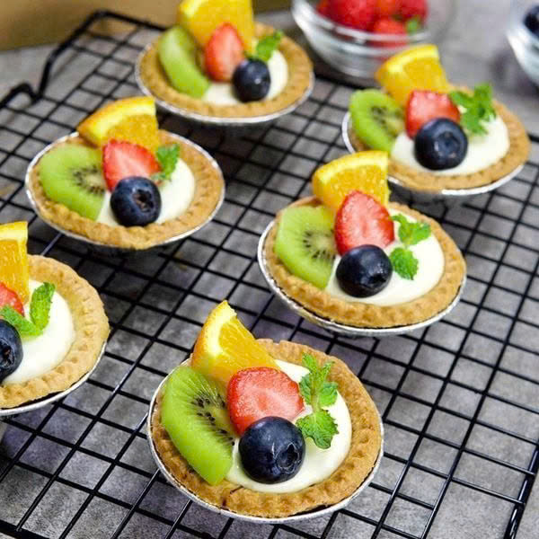 Nhỏ nhắn, xinh xắn, mỗi chiếc tart như một bông hoa ngọt lành. Trang trí bằng mứt cam, kiwi, dâu vừa đẹp mắt vừa giàu vitamin.